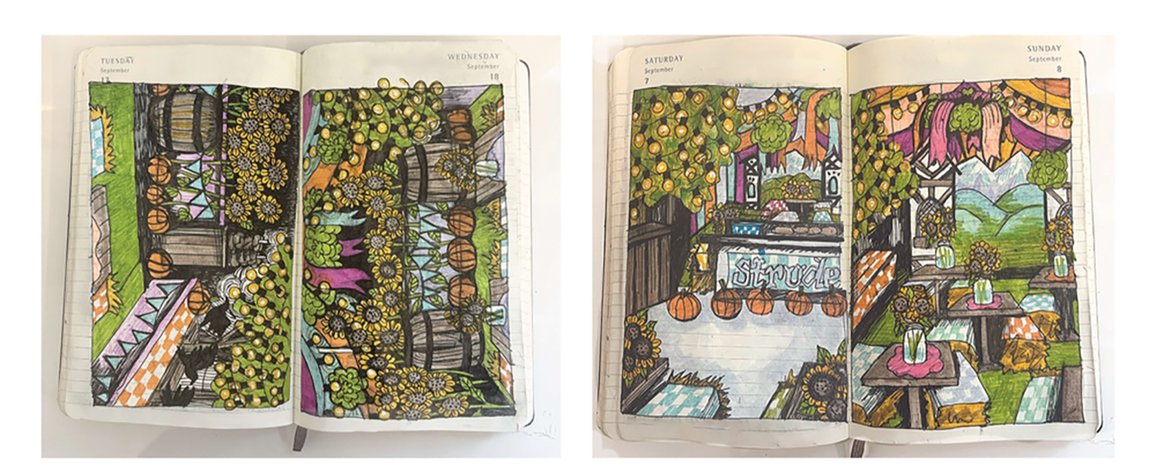 Entrance to Oktoberfest- banners and details like hanging foliage create a portal to the world created for the event. The hand-drawn chalkboard A-frame sign shows ‘Gutentag’ on the front for ‘Hello’ and ‘Auf Wiedersehen’ on the back for ‘Goodbye’.